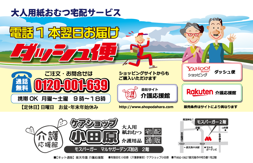 大人用紙オムツを宅配します。重くて、かさばる大人用紙オムツ。 必要なときに必要な分だけお届けします。 電話一本で翌日お届け。 お問合せは、モスバーガーマルヤガーデンズ前店2階『ケアショップ小田原』へどうぞ。