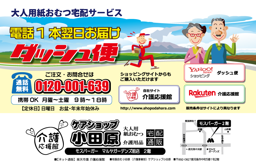 大人用紙オムツを宅配します。重くて、かさばる大人用紙オムツ。 必要なときに必要な分だけお届けします。 電話一本翌日お届け。 お問い合わせは、モスバーガーマルヤガーデンズ前店2階『ケアショップ小田原』へどうぞ。